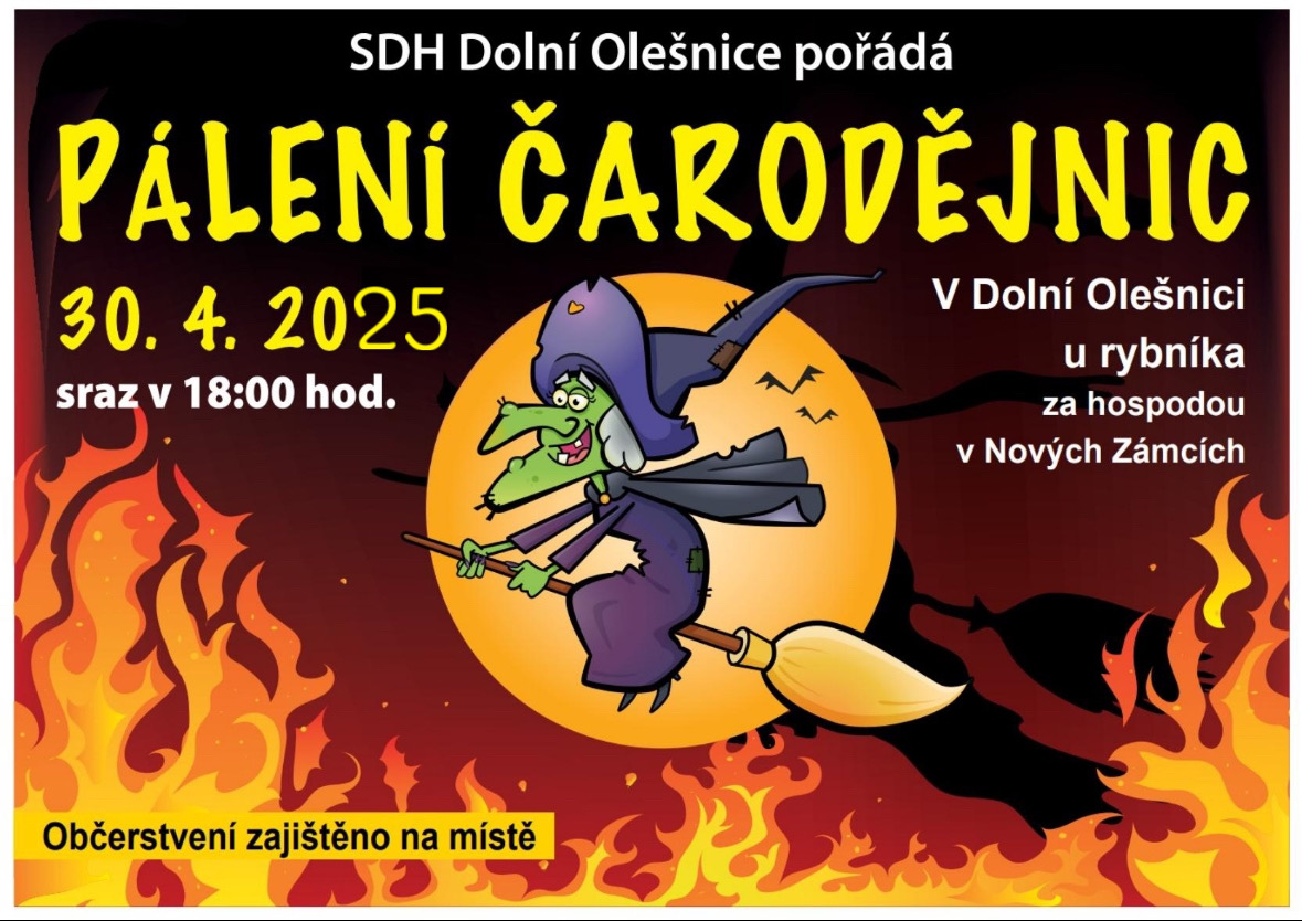 SDH Dolní Olešnice si Vás dovolují pozvat dne 30. 4. 2025 na "Pálení čarodějnic" u rybníka pod hospodou.